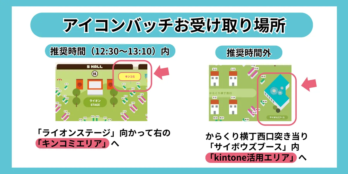 Cybozu Daysの会期中、以下のエリア・時間にて、バッチの受け渡しと交流タイムを実施します!
