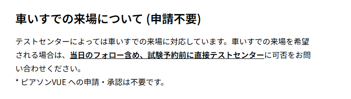 ピアソンの以下ページには、車いすについてはピアソンへの申請ではなく、テストセンターに予約前に問い合わせるように書かれていました。